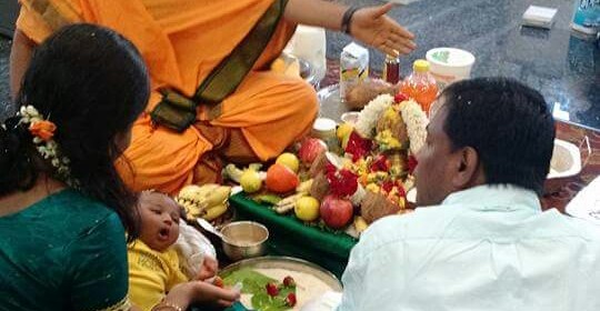 The will carry the naked child upside down and go around the banana leaf 3 times and leave him on the floor. After that they will wear for the baby all the important stuffs which will keep the child from sickness and evil things from attacking him or her. They will dress the child and call for the maternal uncle. He is the brother of mother. He is an important person for every function for the child. Here is where the naming ceremony starts. They will get a bamboo stick and tie the mothers wedding sari as a cradle. Two women will be holding on to each side of the bamboo. Then the maternal uncle will carry the child and will tell the baby’s name in his or her ears 3 times. Then he will place the child in the cradle and telling his name. This is the end of the 16th day.