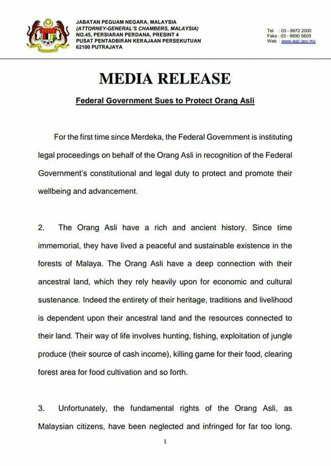For the first time since Merdeka, the federal government is instituting legal proceedings on behalf of the Orang Asli