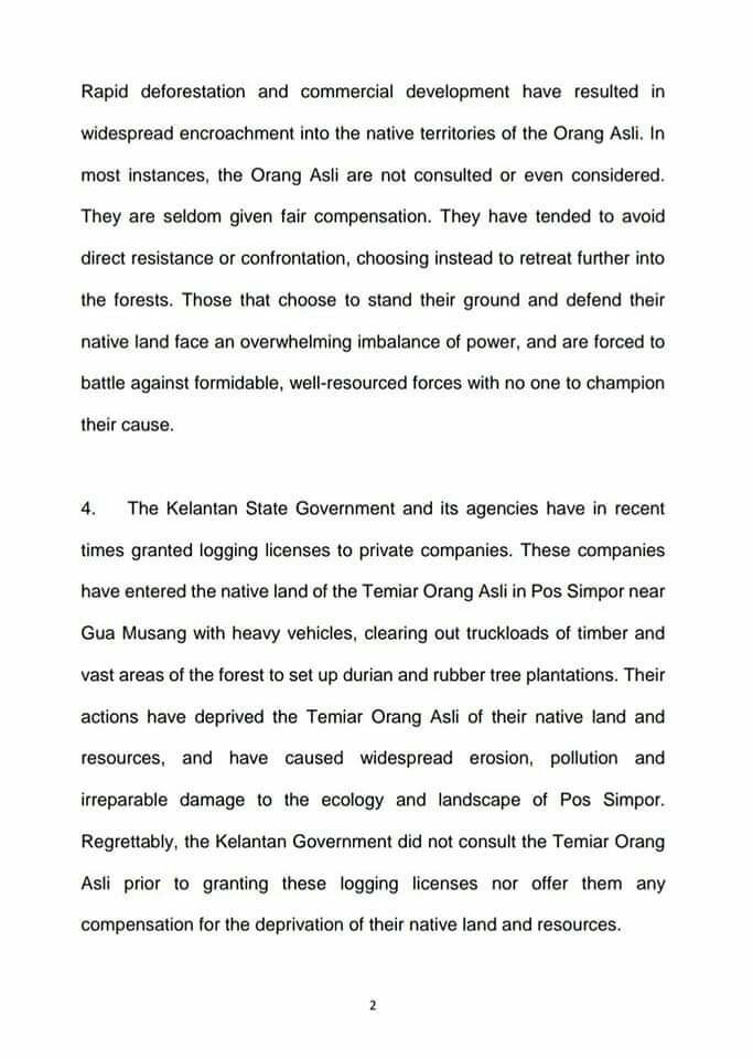 “Their actions have deprived the Temiar Orang Asli of their native land and resources, and have caused widespread erosion, pollution, and irreparable damage to the ecology and landscape of Pos Simpor (in Gua Musang),” he said.