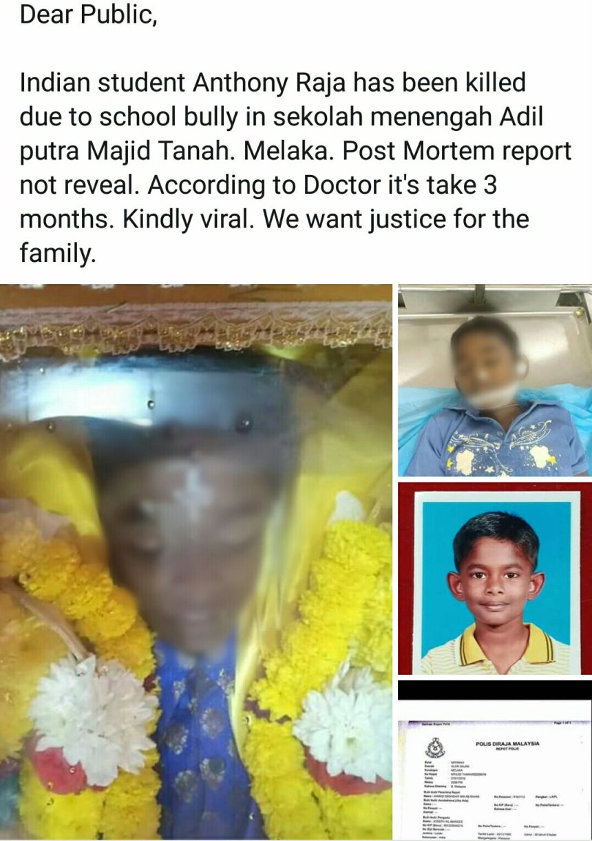 Devite sebelum ini dilaporkan, mendakwa kematian anaknya dipercayai mempunyai kaitan dengan dakwaan mangsa yang dibuli di sekolahnya sehingga mengalami kesakitan pada kaki kiri pada 24 Januari lalu.
