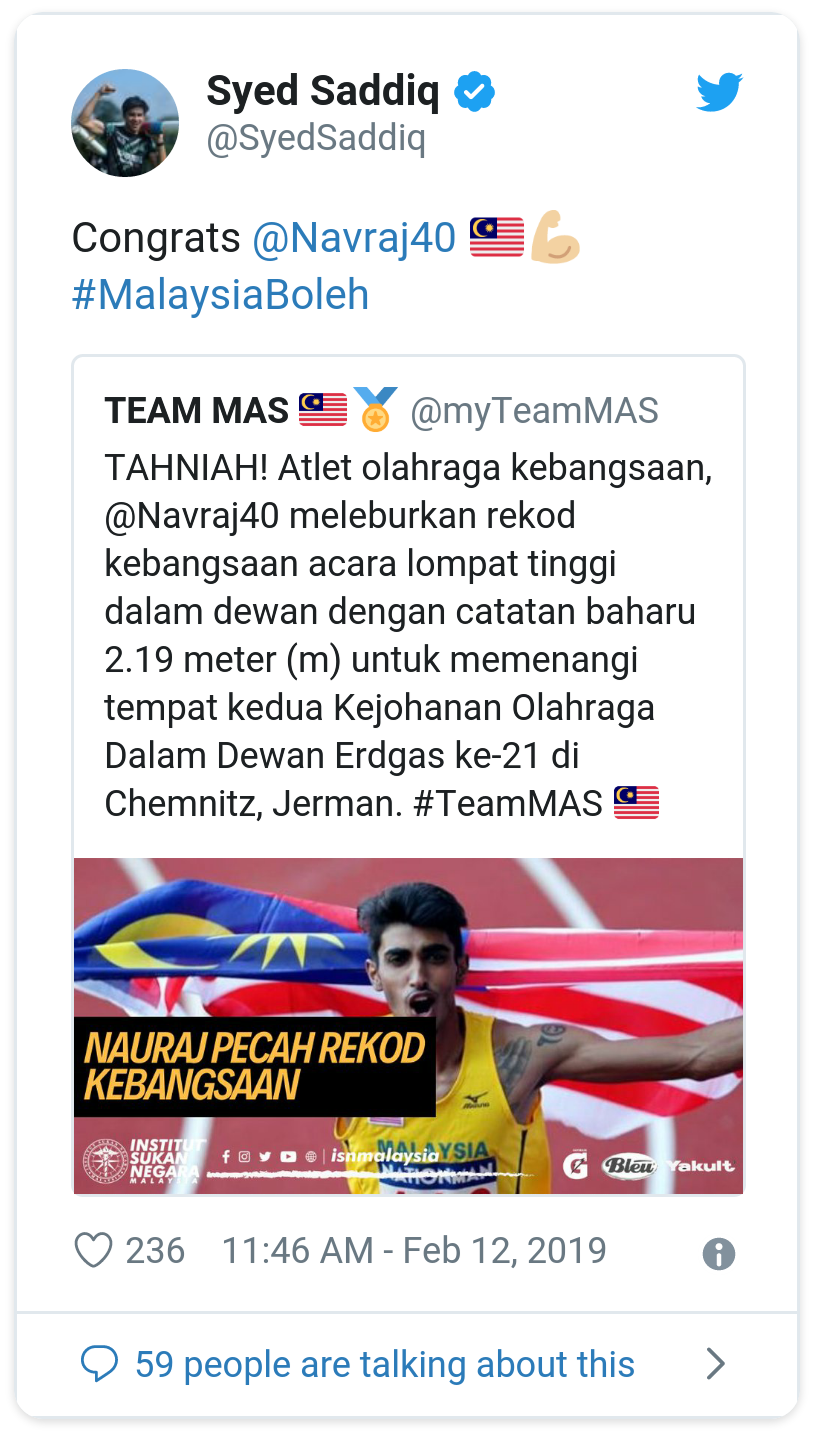 Kejayaan beliau turut diraikan Menteri Belia dan Sukan, Syed Saddiq Syed Abdul Rahman menerusi Twitternya dengan memberikan ucapan tahniah.