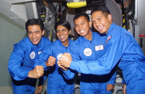 KUALA LUMPUR, 14 Mac — KE RUSIA … Empat calon angkasawan negara (dari kiri) doktor perubatan Dr Sheikh Muszaphar Shukor, 34, jurutera S. Vanajah, 35, doktor pergigian Faiz Khaleed, 26, dan juruterbang Mohammed Faiz Kamaluddin, 34, berkongsi kegembiraan selepas terpilih menjalani latihan di Rusia tidak lama lagi.