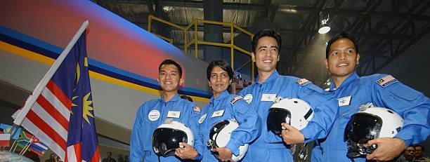 Kuala Lumpur, MALAYSIA: From left, Mohammed Faiz Kamaluddin, S. Vanajah Siva Subramaniam, Sheikh Muszaphar Shukor and Faiz Khaleed stand beside the national flag 14 March 2006 following their selection among other aspirants at the Royal Malaysian Air Force base in Kuala Lumpur who will be sent to Russia for further medical tests and training in a bid to become the first Malaysians to blast off into space. AFP PHOTO (Photo credit should read STR/AFP/Getty Images)