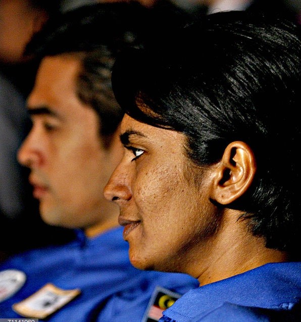 Kuala Lumpur, MALAYSIA: Malaysian woman astronaut candidate S. Vanajah (C) listens to a public lecture on space travel while male compatriots Sheikh Muszaphar Shukor (L) and Faiz Khaleed (R) look on at the National Planetarium in Kuala Lumpur, 26 April 2006. One woman and three men are vying for the honour of becoming the first astronaut from Malaysia, a country which has a mania for record-setting and seeking recognition on the world stage. AFP PHOTO/TENGKU BAHAR (Photo credit should read TENGKU BAHAR/AFP/Getty Images)
