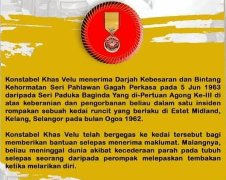 Lebih tepat lagi, Konstabel Velu adalah rakyat pertama yang dianugerahkan pingat tertinggi negara itu!