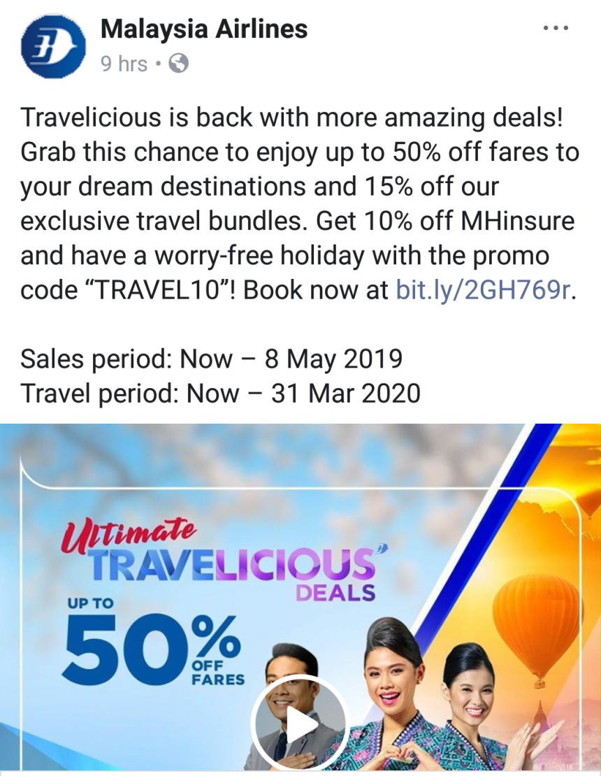 MALAYSIA Airlines menawarkan potongan harga sehingga 50 peratus untuk kadar tambang bermula semalam hingga 8 Mei nanti melalui kempen Ultimate Travelicious Deals.