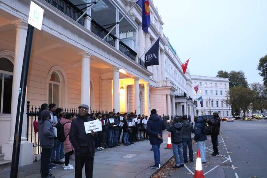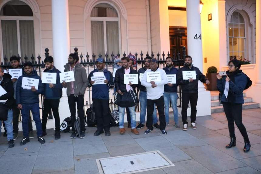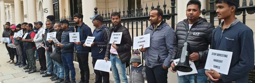 Unhappy over the unfair arrests of 12 Malaysian Tamils under charges of purported links to defunct terrorist group Liberation Tigers of Tamil Eelam (LTTE), a group of British-Tamil staged a demonstration outside the Malaysian High Commission in London yesterday.