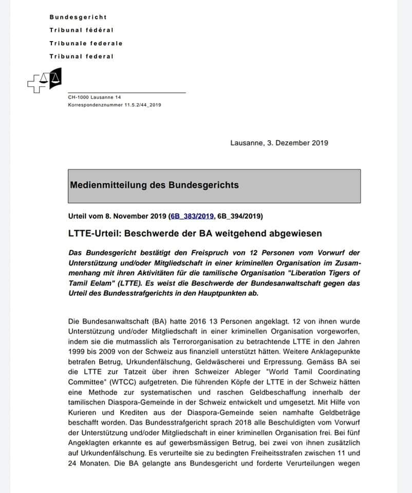 In its indictment, the OAG had accused the people of violating the Swiss Penal Code by raising funds for the Liberation Tigers of Tamil Elam (LTTE) between 1999 and 2009. After its nine-year investigation, the OAG suspected the accused of financially supporting the World Tamil Coordinating Committee (WTCC).