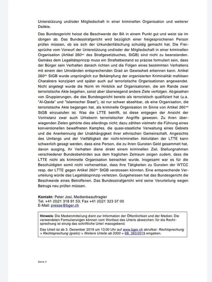 But in June 2018 the Federal Criminal Court found that the hierarchical link between the LTTE and WTCC could not be sufficiently established. The judges also felt there was not enough proof to consider the LTTE a criminal group.