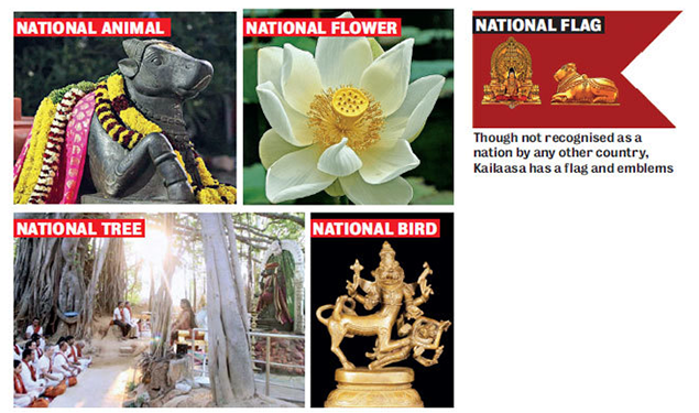 6. ‘Kailaasa’ already has a flag called ‘Rishabha Dhvaja’ that features Nithyananda, passports, emblem, national animal (Nandi – the sacred bull that is the vehicle of Lord Shiva), bird (Sharabam – a mythological creature that resembles a lion with wings) , flower (lotus) and tree (banyan). It is currently not recognised by any other country. There are three official languages – English, Sanskrit and Tamil.