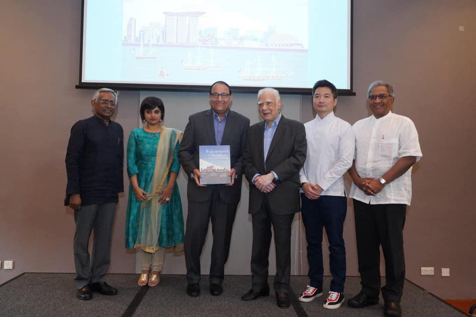 (From left) Arun Mahizhnan and Nalina Gopal, editors of “Sojourners to Settlers – Tamils in Southeast Asia and Singapore”; Minister for Communication and Information S Iswaran; Ambassador-at-large Gopinath Pillai; Chairman of IHC’s advisory board, Alvin Tan, DCE, National Heritage Board; and Janadas Devan, Director of IPS.