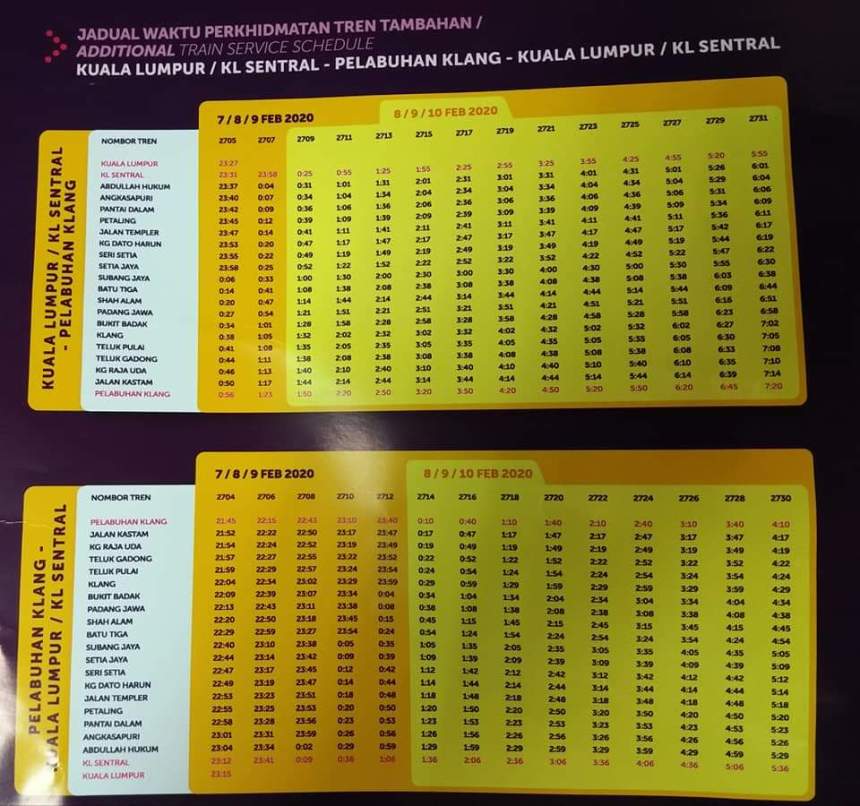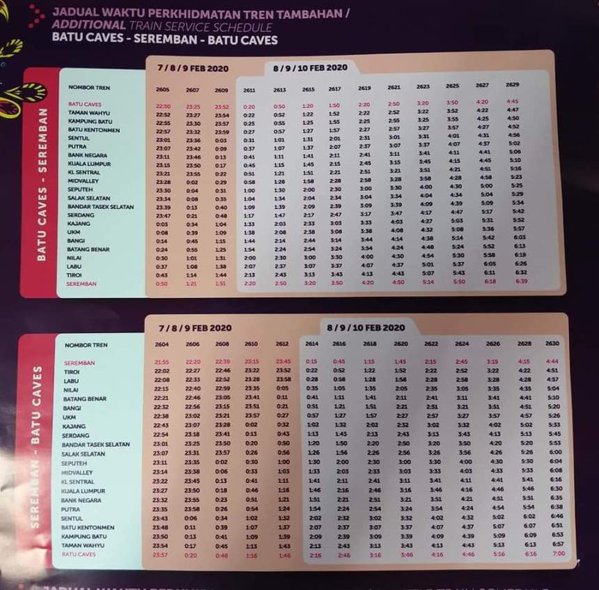 THAIPUSAM 2020: 24-HOUR SPECIAL KTM TRAIN SERVICES (SCHEDULE TABLE INCLUDED)